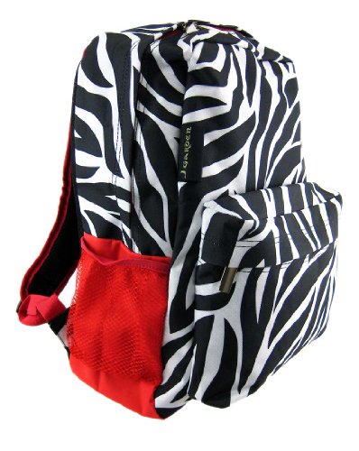 This great looking black, and white zebra stripe print backpack, with red trim, is great for students or campers, and makes a great overnight bag. Measuring 16 inches high, 12 inches wide and 4 inches deep, it has a padded back section, padded shoulder straps, a mesh side pocket, a zippered front exterior pocket, and has a large interior section for whatever you need to pack in it.This bag makes a great present for anyone who loves animal prints.